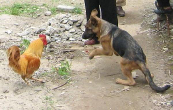 德牧对我“围追堵截”,吓得我仓皇逃跑,好几次我差点儿被他利牙所伤,难道我躲过了无数次人类的黑手,今天要将我的‘鸡’命结束在狗嘴下吗?实在是无法想象的恐怖。幸亏一位好心的小男孩用水枪阻挡了它的视线,给了我逃跑的机会。我拼命向藏獒兄那儿跑去,果然有效,这只初出茅庐的小德牧被狗中之王的藏獒兄吓住了。我又一次险中脱困。