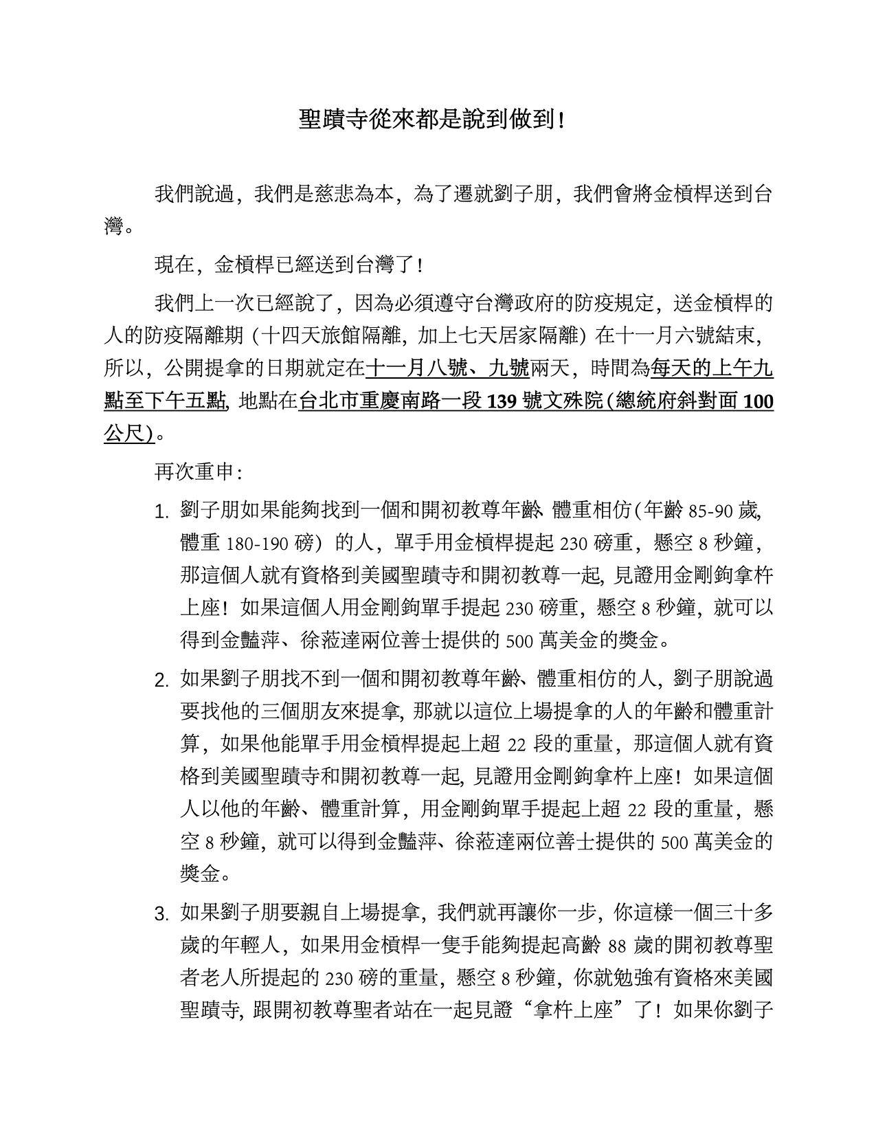 我们上一次已经说了,因为必须遵守台湾政府的防疫规定,送金杠杆的人的防疫隔离期(十四天旅馆隔离,加上七天居家隔离)在十一月六号结束,所以,公开提拿的日期就定在十一月八号、九号两天,时间为每天的上午九点至下午五点,地点在台北市重庆南路一段139号文殊院(总统府斜对面100公尺)。