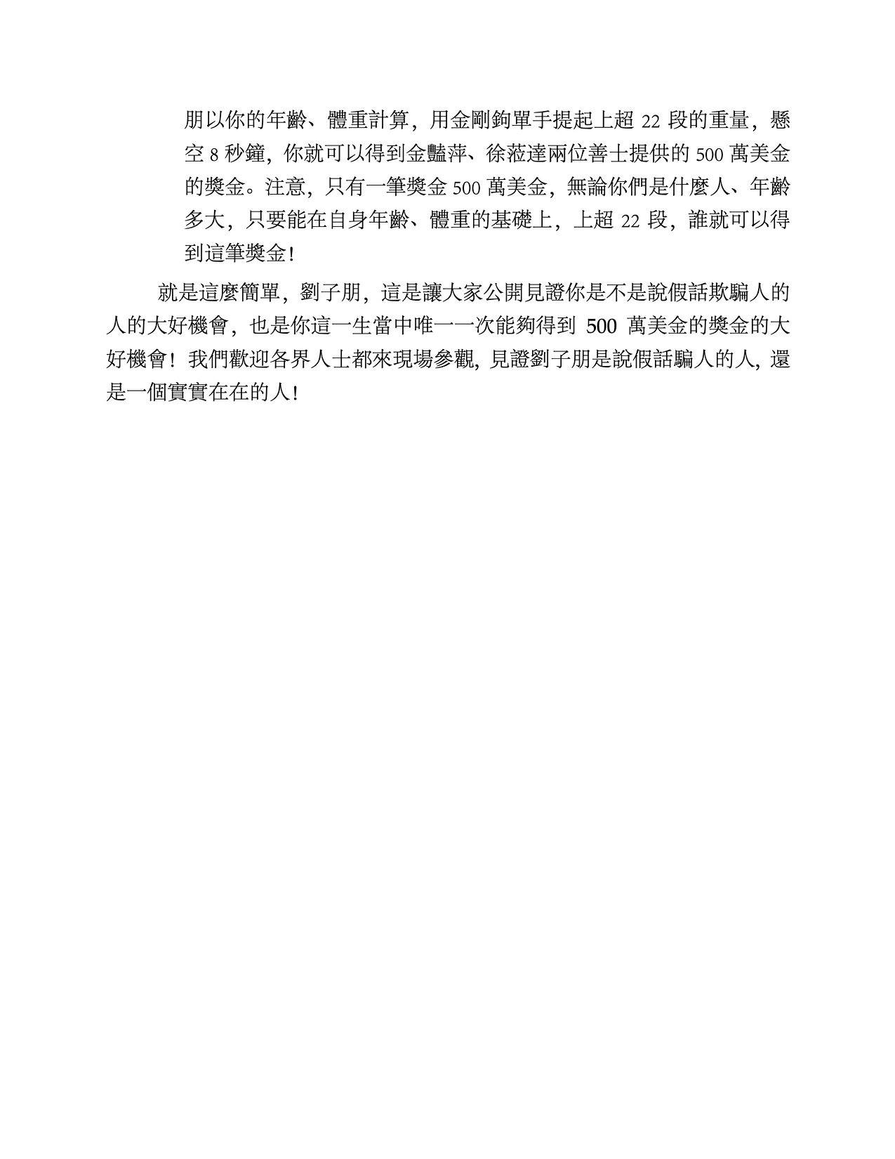 3. 如果刘子朋要亲自上场提拿,我们就再让你一步,你这样一个三十多岁的年轻人,如果用金杠杆一只手能够提起高龄88岁的开初教尊圣者老人所提起的230磅的重量,悬空8秒钟,你就勉强有资格来美国圣迹寺,跟开初教尊圣者站在一起见证“拿杵上座”了!如果你刘子朋以你的年龄、体重计算,用金刚钩单手提起上超22段的重量,悬空8秒钟,你就可以得到金艳萍、徐莅达两位善士提供的500万美金的奖金。注意,只有一笔奖金500万美金,无论你们是什么人、年龄多大,只要能在自身年龄、体重的基础上,上超22段,谁就可以得到这笔奖金!