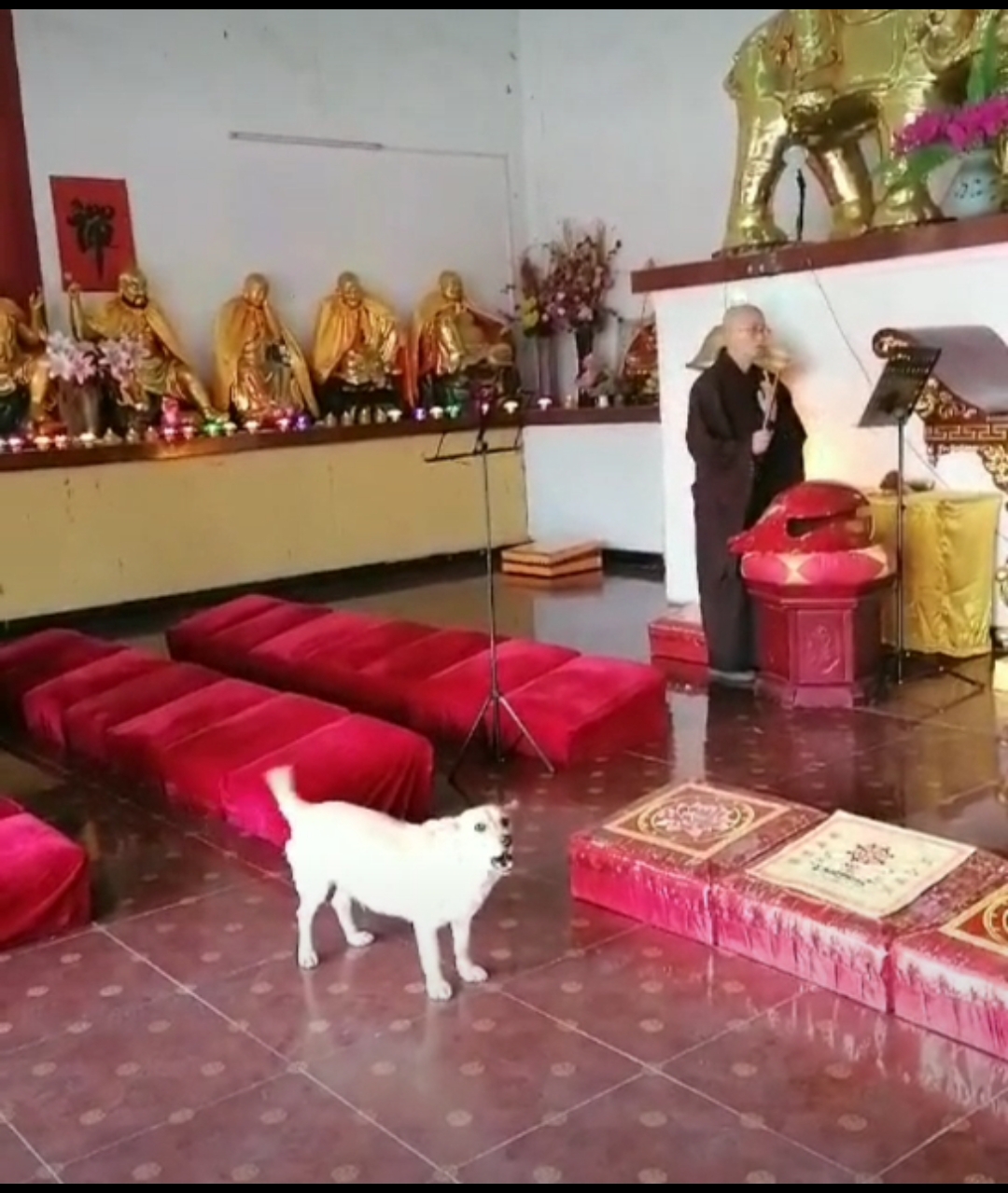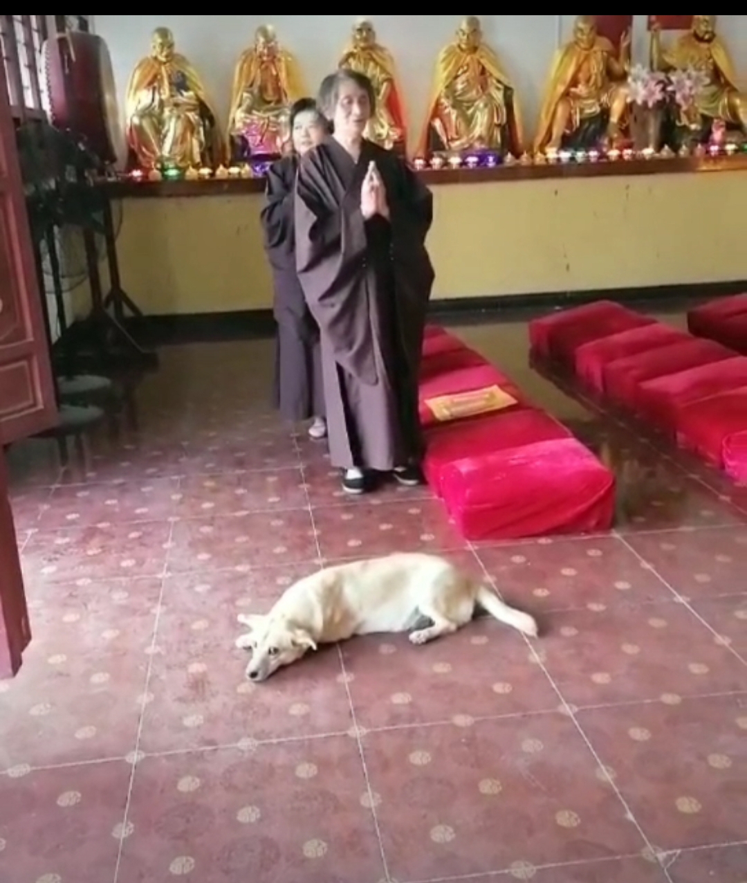 最值得一提的是这狗狗“佛缘很深”,也许在无始劫轮回中,牠们也曾经是“出家人”吧,每当出家师在大雄宝殿里开始诵经的时候,牠俩就会在大殿门口跟着唱,有时还会进入大殿,趴在拜垫上参加完整的诵经。我看到牠们在唱“忏悔文”时流泪;我看到牠们在诵《观世音菩萨普门品》时兴奋;我看到牠们在诵《佛说阿弥陀经》时法喜充满,看着看着,牠们就是和我一样的两个人,在求解脱的苦难众生。