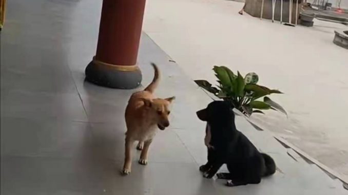 这只小狗叫缘缘,很小被送到了寺院。初来乍到时,它非常淘气,不仅乱叫,喜欢叼鞋、叼厕纸,还随意大小便。经过出家师的教育和引导,它慢慢安静了下来,还懂得了礼貌。更有趣的是,它跟着出家师上殿,参加早晚课。只要有唱诵的地方,它就“汪汪汪”跟着唱,而且声音洪亮。