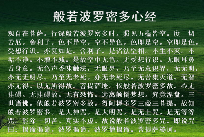 观自在菩萨。行深般若波罗密多时。照见五蕴皆空。度一切苦厄。舍利子。色不异空。空不异色。色即是空。空即是色。受想行识。亦复如是。舍利子。是诸法空相。不生不灭。不垢不净。不增不减。是故空中无色。无受想行识。无眼耳鼻舌身意。无色声香味触法,无眼界,乃至无意识界,无无明,亦无无明尽。乃至无老死。亦无老死尽。无苦集灭道。无智亦无得。以无所得故。菩提萨埵。依般若波罗密多故。心无挂碍。无挂碍故。无有恐怖。远离颠倒梦想。究竟涅盘。三世诸佛。依般若波罗密多故。得阿耨多罗三藐三菩提。故知般若波罗密多。是大神咒。是大明咒。是无上咒。是无等等咒。能除一切苦。真实不虚。故说般若波罗密多咒。即说咒曰:揭谛揭谛。波罗揭谛。波罗僧揭谛。菩提萨婆诃。